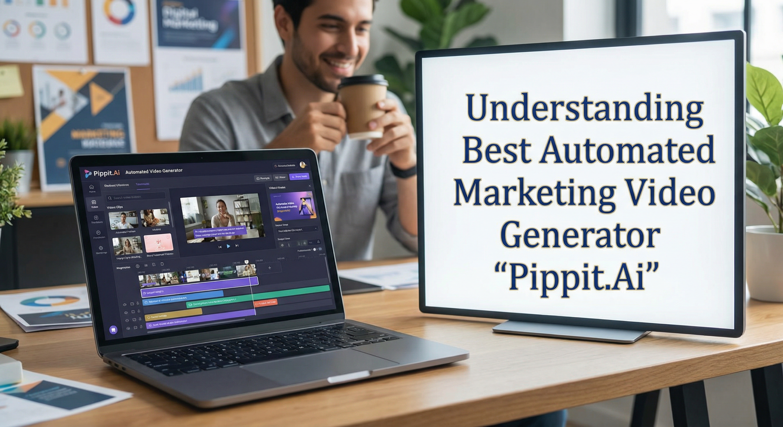 Marketer editing clips on a laptop timeline beside a monitor in an office, showcasing best Automated marketing video generator in action.