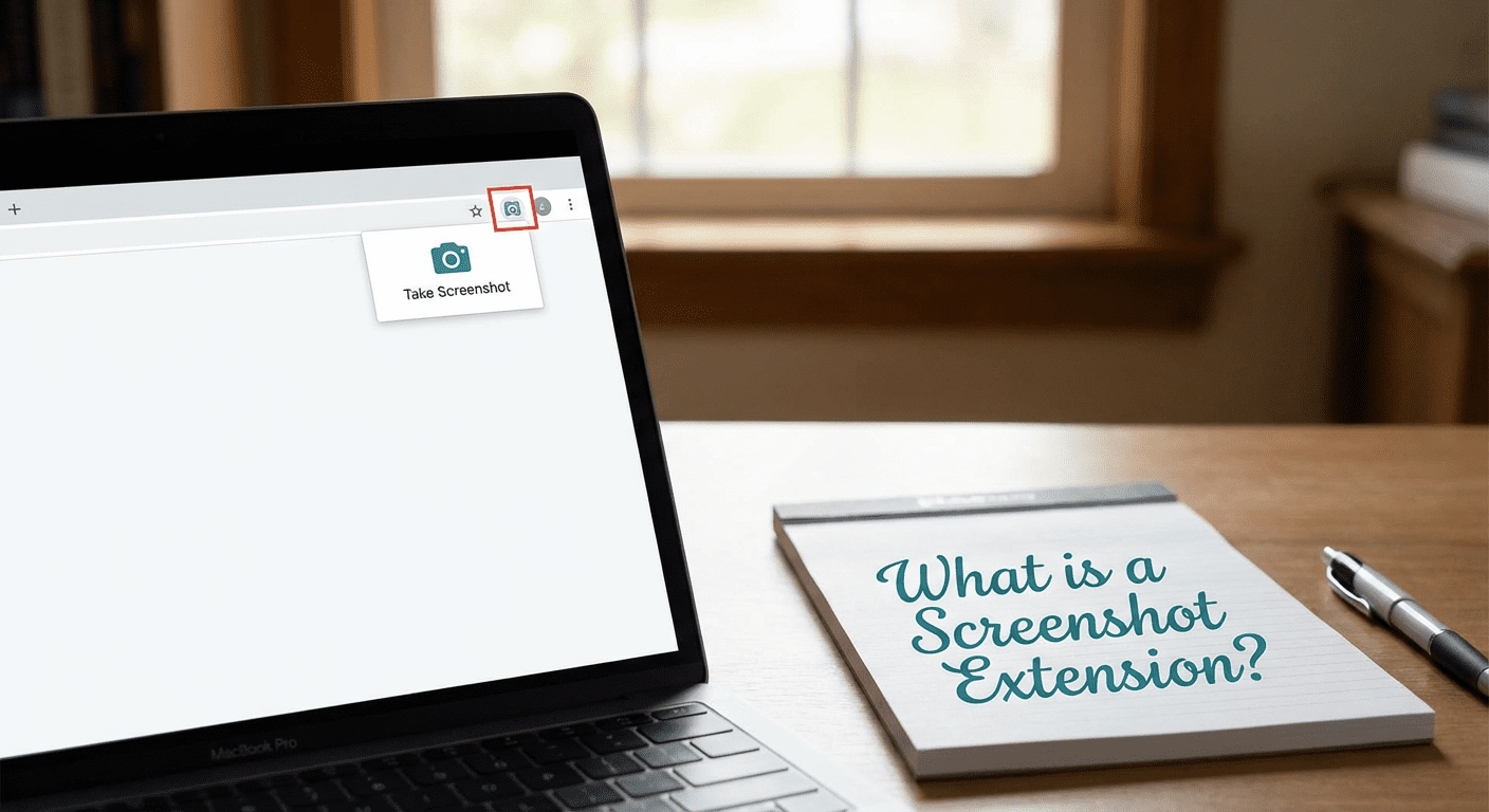Browser window showing a screenshot extension icon with 'Take Screenshot' tooltip, next to a notepad asking 'What is a Screenshot Extension?'